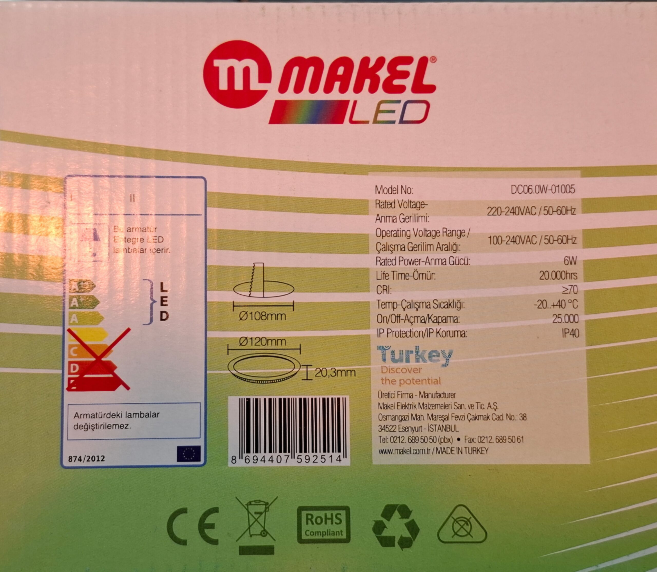 پنل LED توکار باریک گرد 6 وات ماکل که یکی از معروفترین برندهای پنل ال ای دی در ترکیه میباشد.